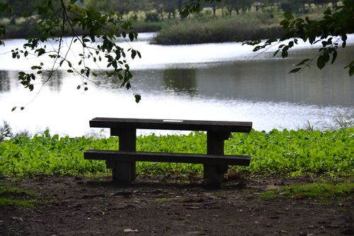 コスモスとわらアートを見た後、もう少し池のほとりを散歩します。 天気も今一つなので、静かで、寂しい感じがします。 歩いていると、時々、ポツンとベンチがあります。 足元には、クヌギが落ちています。すっかり秋ですね・・・。 池には、カモやほかの水鳥も…