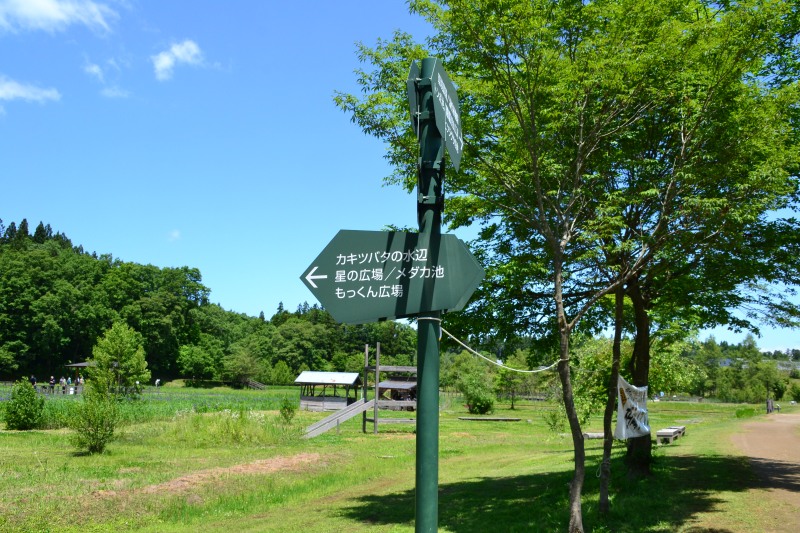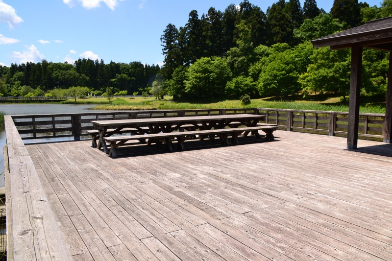 遠くに、東屋(観察舎)が見えます。あれっ・・・、鯉のぼりも泳いでいますね。
