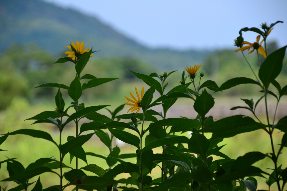 山や木々を背景に、黄色いひまわりが、ひときわ美しく見えます。