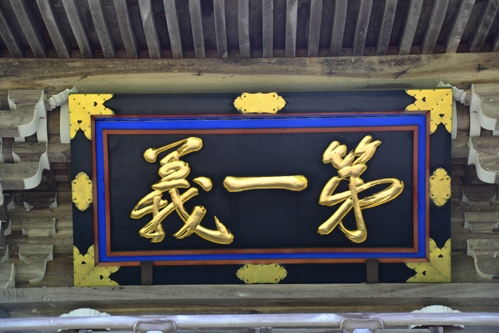 山門の扁額は、正面に「春日山」、後面に「第一義」が掲げられています。