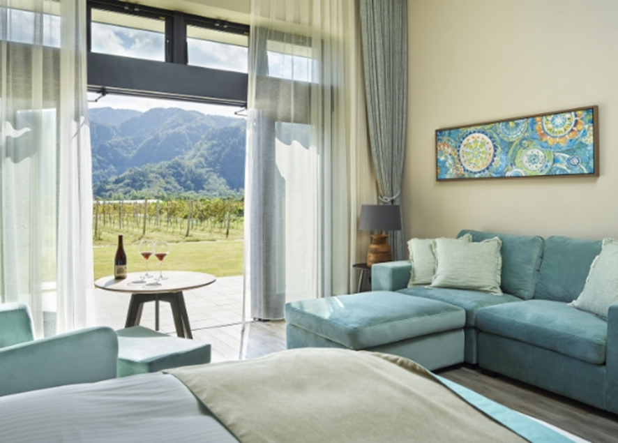 どの部屋からも、ぶどう畑を眺めることができます。ウェルカムドリンクには、ス